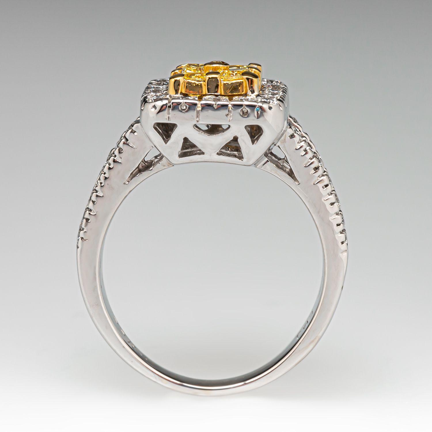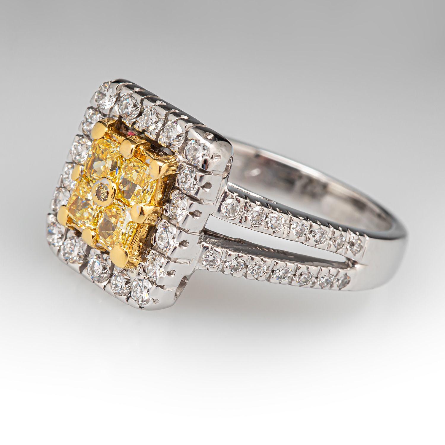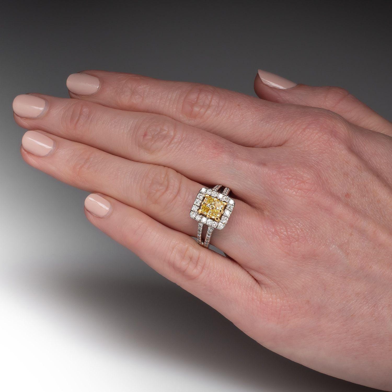 This dazzling fancy yellow diamond ring blends modern luxury with timeless sophistication. At its heart, four prong-set, cut-cornered square yellow diamonds are accented by a single bezel-set round yellow diamond, creating a unique clustered centerpiece that radiates vibrant golden fire.