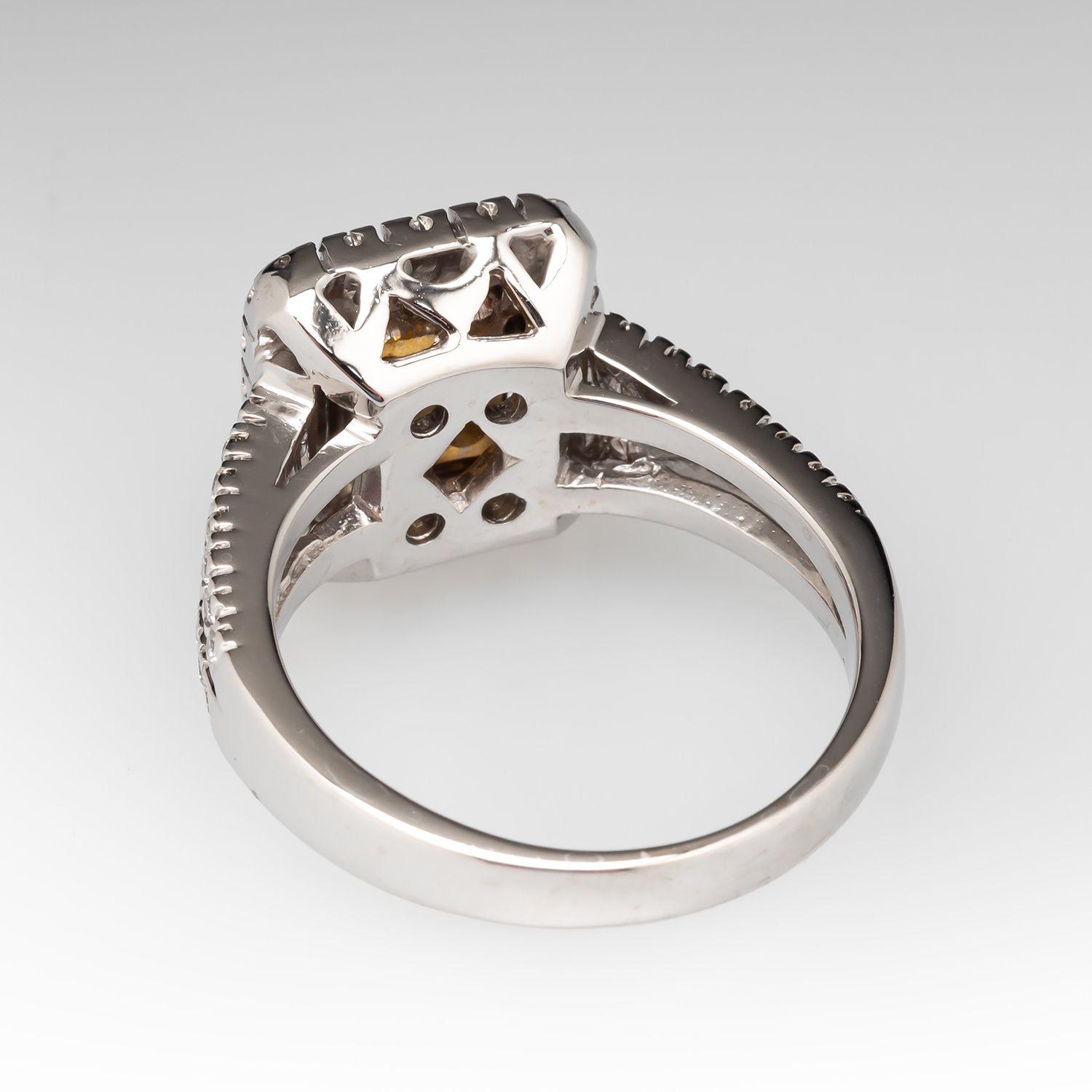 Fancy Yellow Diamond Halo Engagement Ring | White Gold & Yellow Gold Tips | 1.38ctw Natural Diamonds | Square Cut Diamond Anniversary Ring |