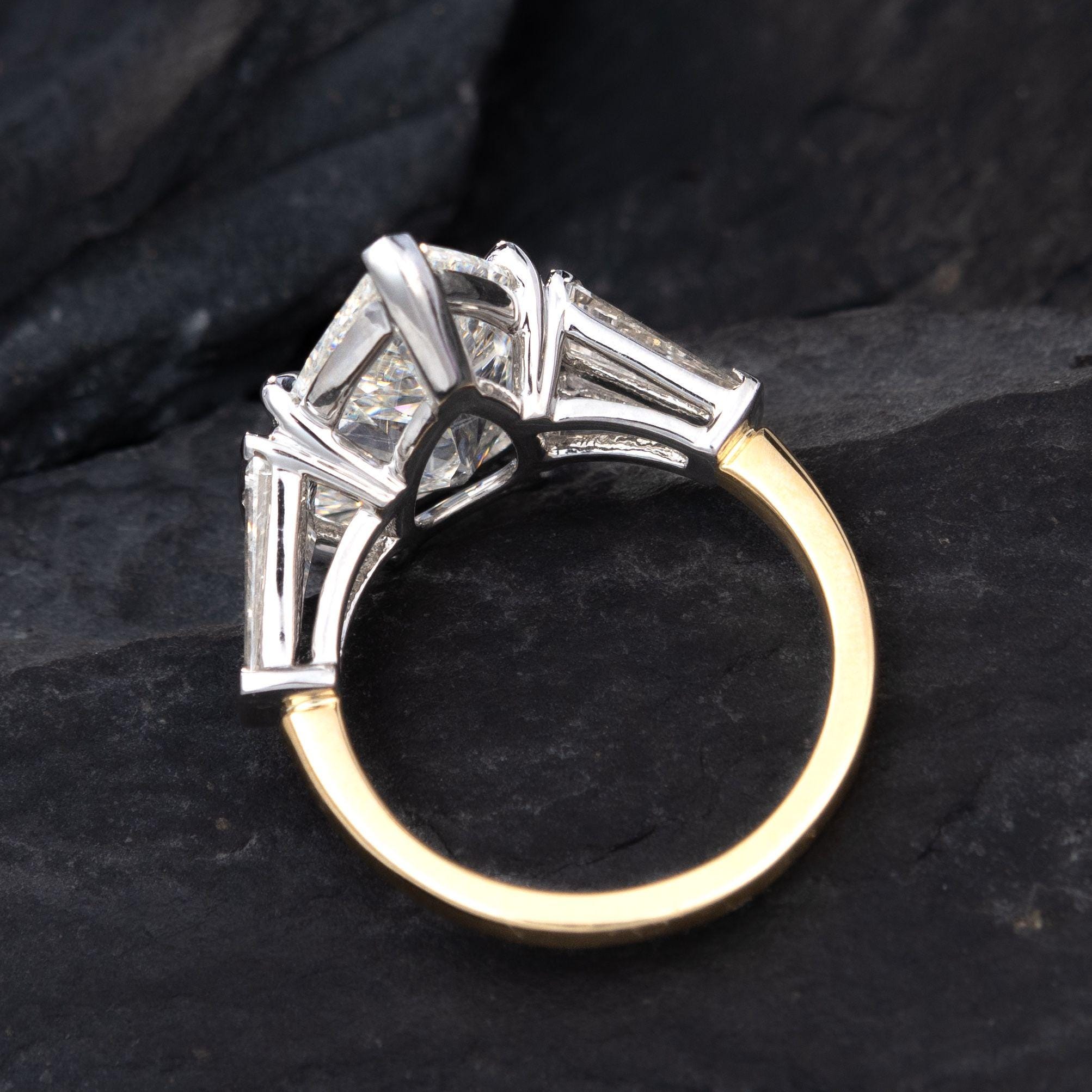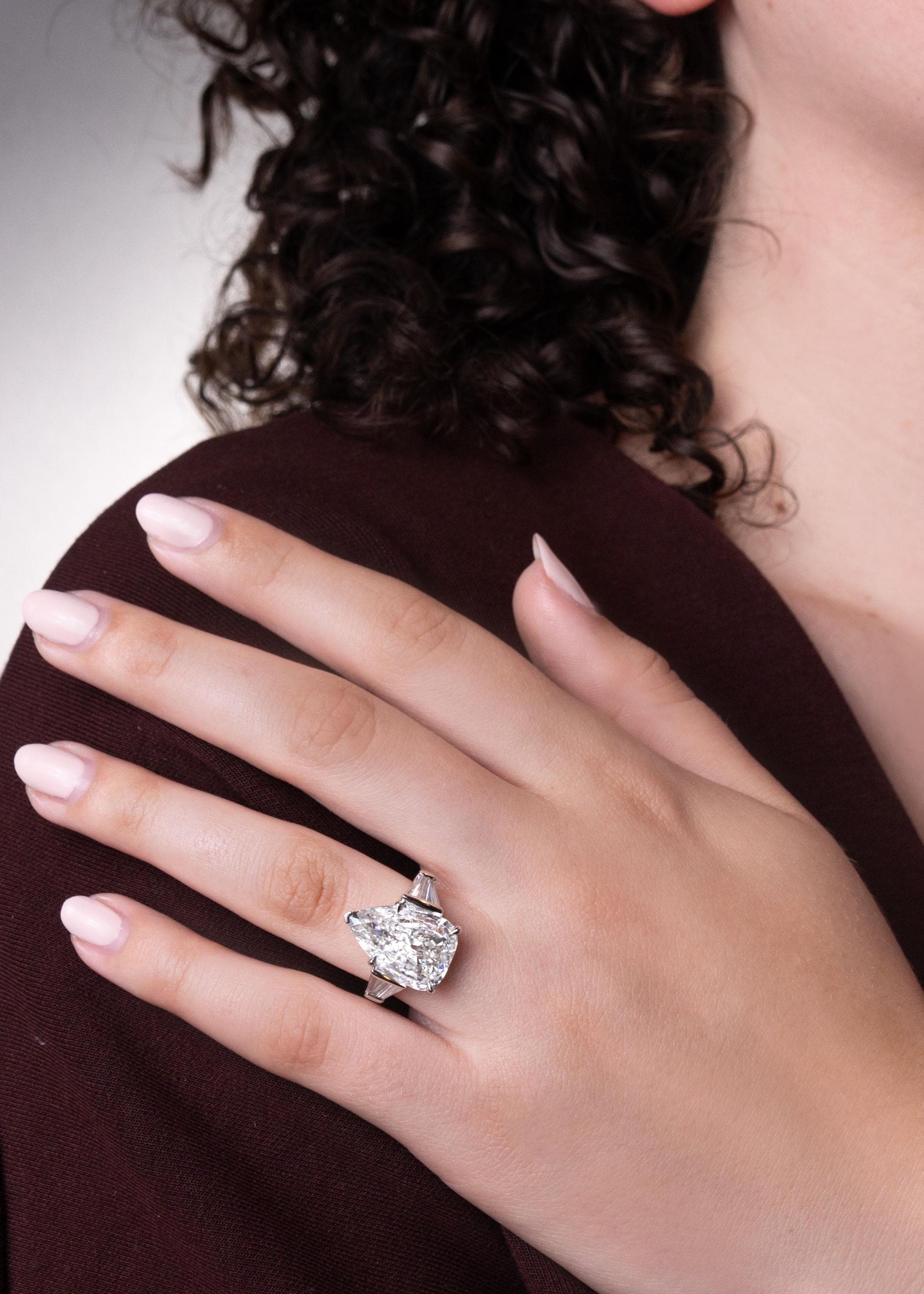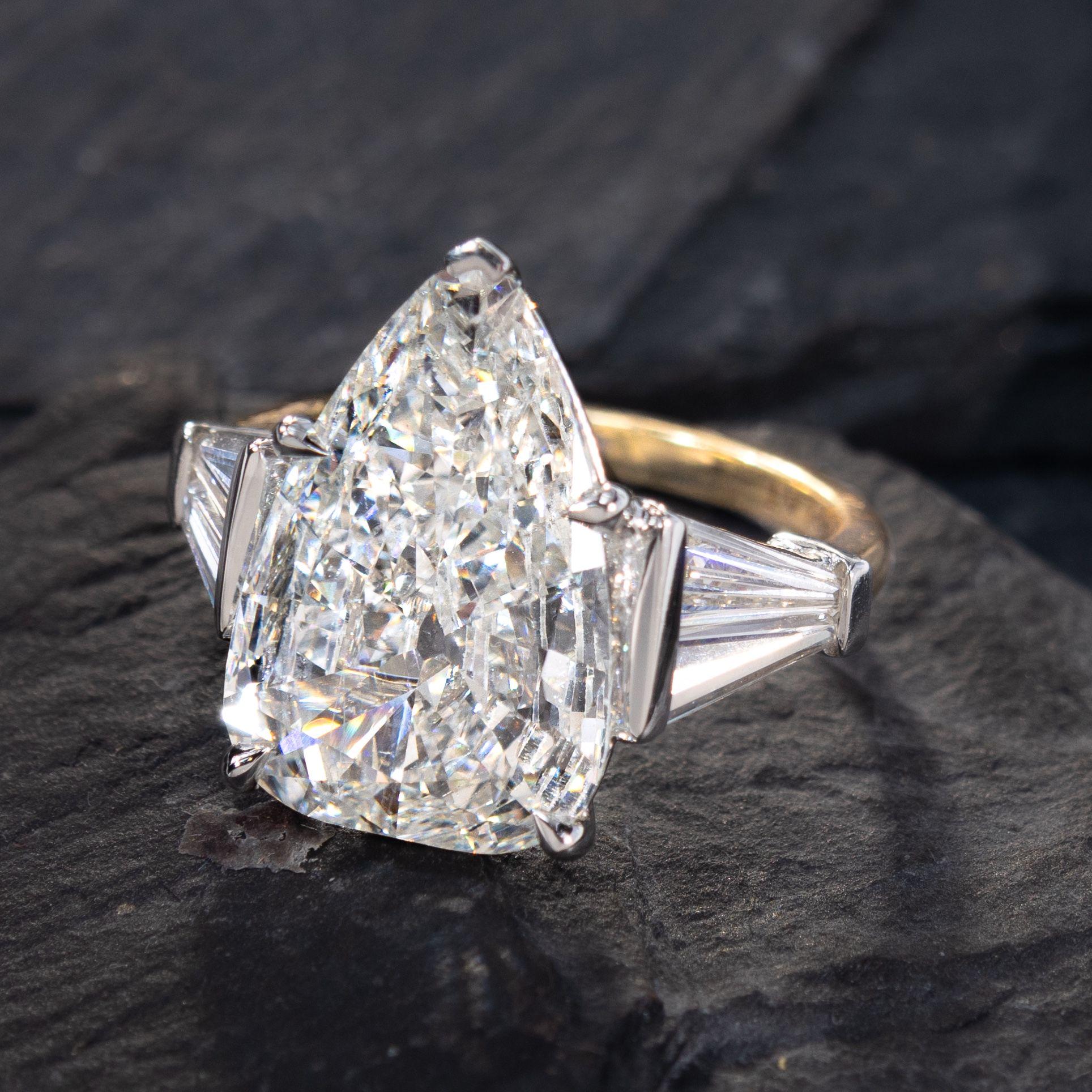 This extraordinary engagement ring showcases a 6.20 carat pear-cut diamond, shimmering with brilliance and elegance. Graded G in color and SI2 in clarity, the center stone strikes the perfect balance of size, sparkle, and beauty. Flanking the center are four tapered baguette diamonds, adding symmetry and subtle fire.