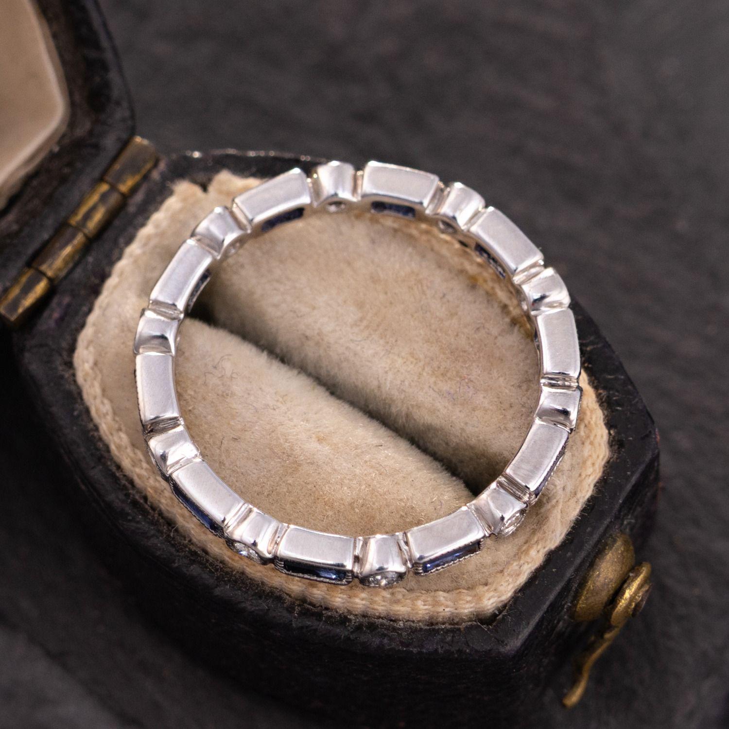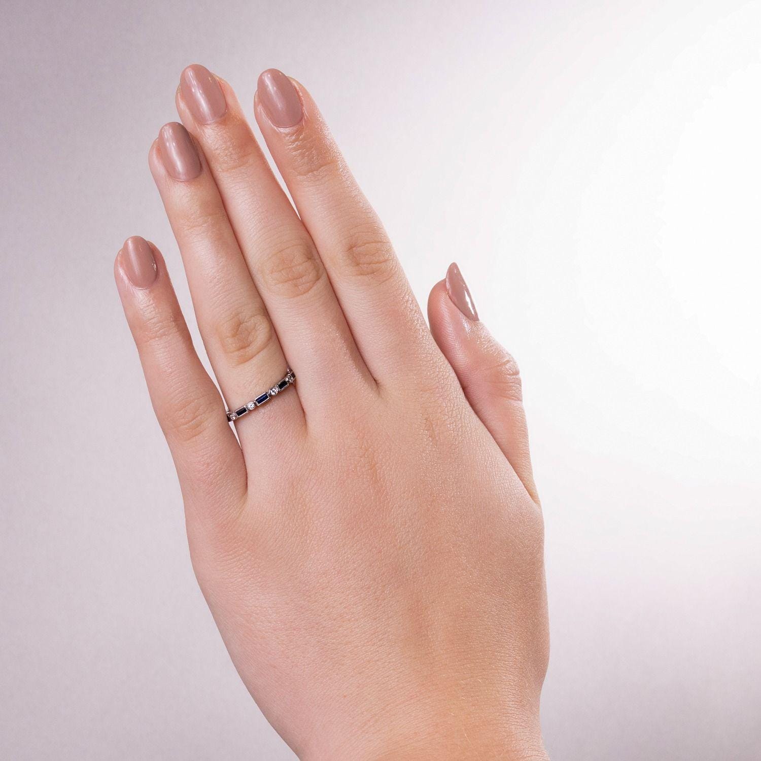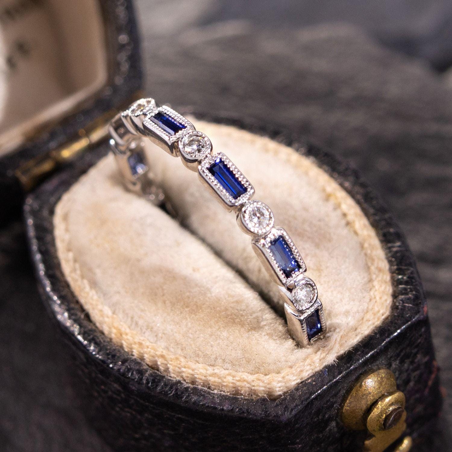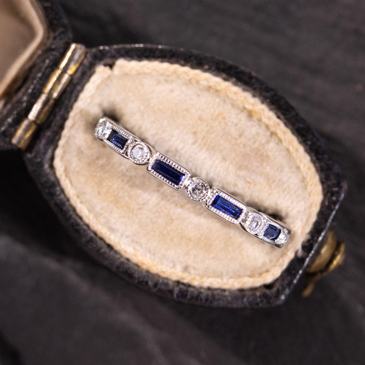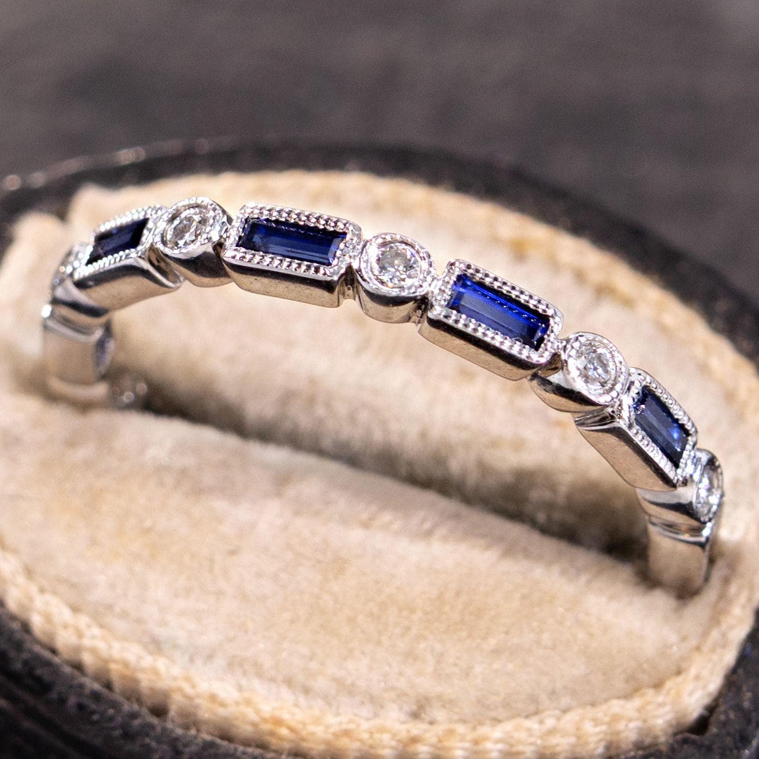 sapphire band, moissanite blue, diamond ring, white gold band, eternity ring, milgrain ring, art deco band, stacking band, blue gemstone, wedding band, dainty ring, gift for her, fine jewelry, white gold sapphire band, moissanite sapphire eternity ring, diamond and sapphire wedding band, milgrain bezel art deco ring, baguette sapphire stacking ring, blue gemstone anniversary band, fine jewelry white gold ring, sapphire diamond bridal band, vintage style eternity ring, modern sapphire diamond band, gemstone stacking jewelry, sapphire diamond gift ring, handmade gold eternity band.