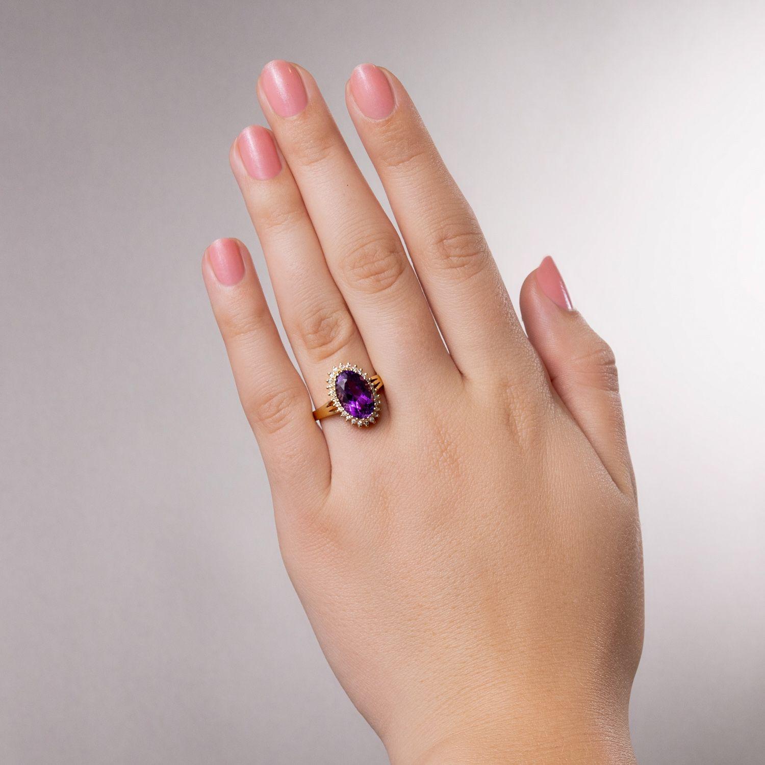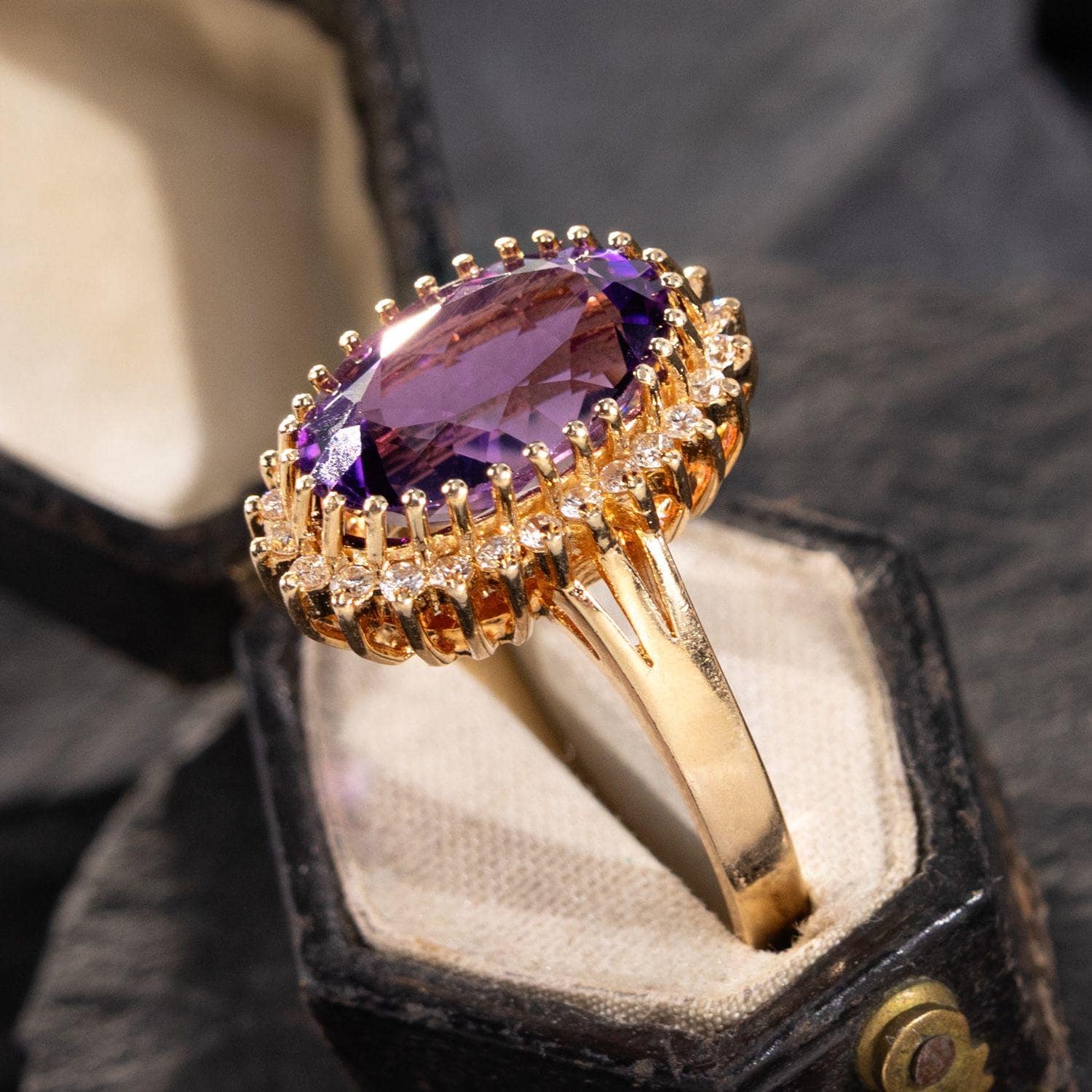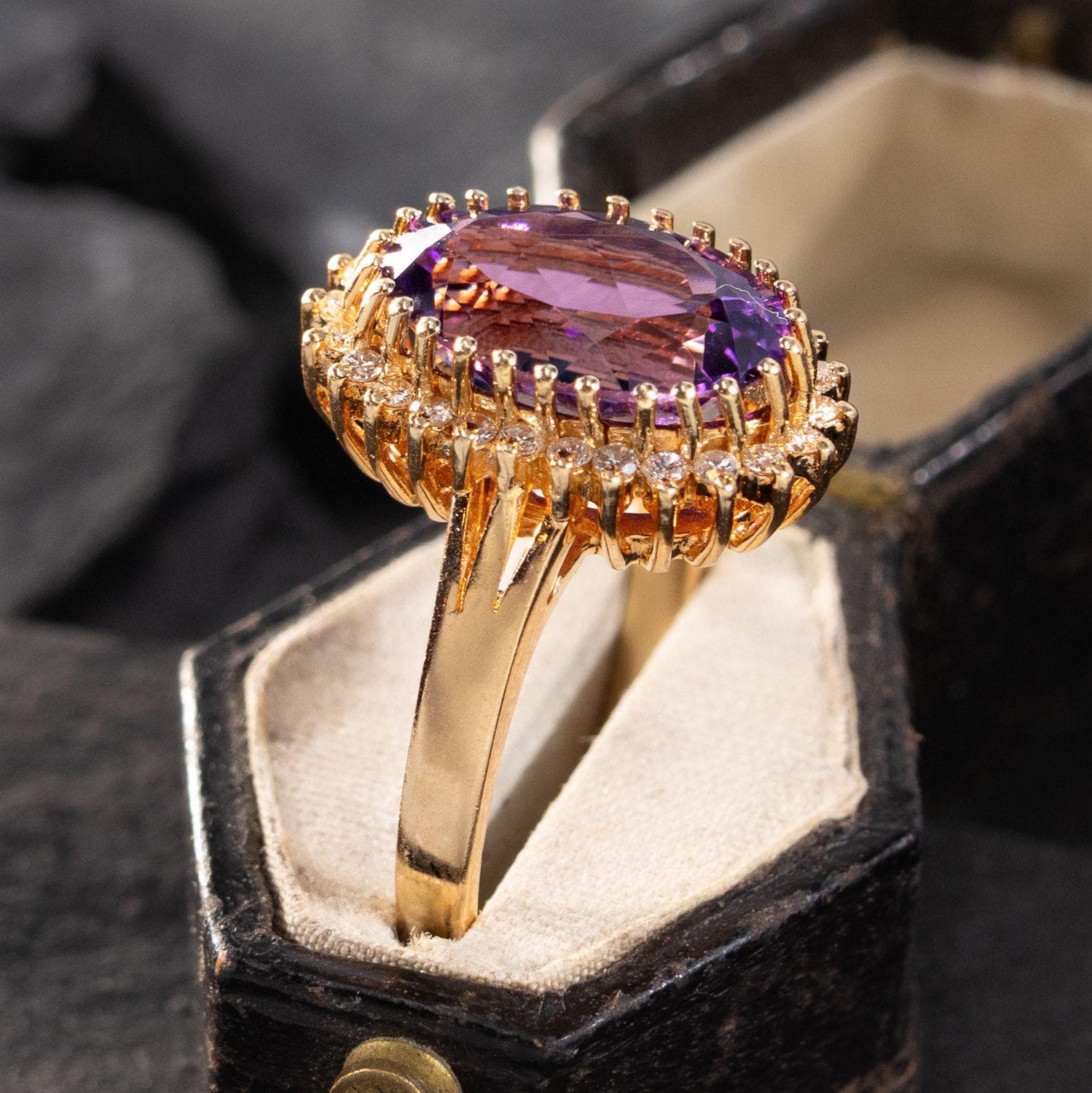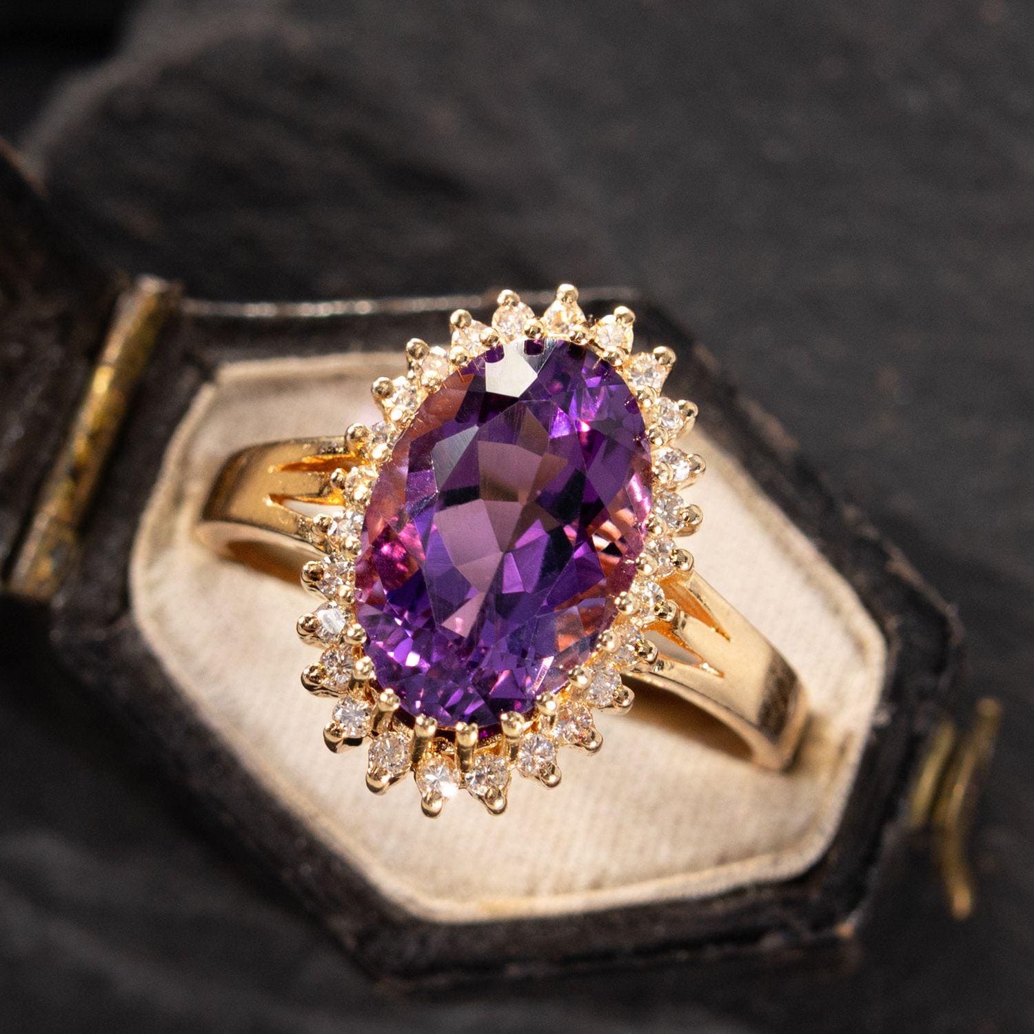 yellow gold amethyst ring, oval amethyst halo ring, diamond accent gold ring, purple gemstone cocktail ring, vintage style gold ring, 3 carat amethyst ring, halo diamond gemstone ring, gold birthstone jewelry, elegant statement ring, luxury fine gemstone ring, heirloom quality amethyst ring, anniversary gift for her, romantic purple halo ring, amethyst ring, halo ring, yellow gold ring, purple gemstone, oval amethyst, diamond halo, cocktail ring, vintage ring, gold amethyst ring, statement ring, february birthstone, fine jewelry, gift for her
